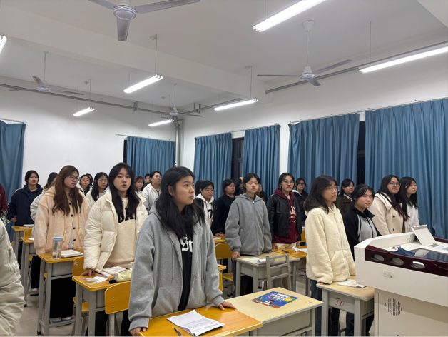 本次团课通过唱团歌、播放“新时代青年榜样”短片、分组讨论等方式开展。最后,团课以“青春誓言”环节收尾,全体学生举起右拳,庄重承诺“以志向为帆,以奋斗为桨,为国家荣耀贡献青春力量”,将团课氛围推向高潮。